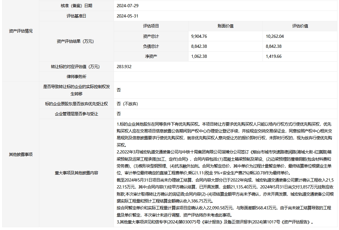 煙臺(tái)城宏軌道交通裝備科技有限公司20%股權(quán)