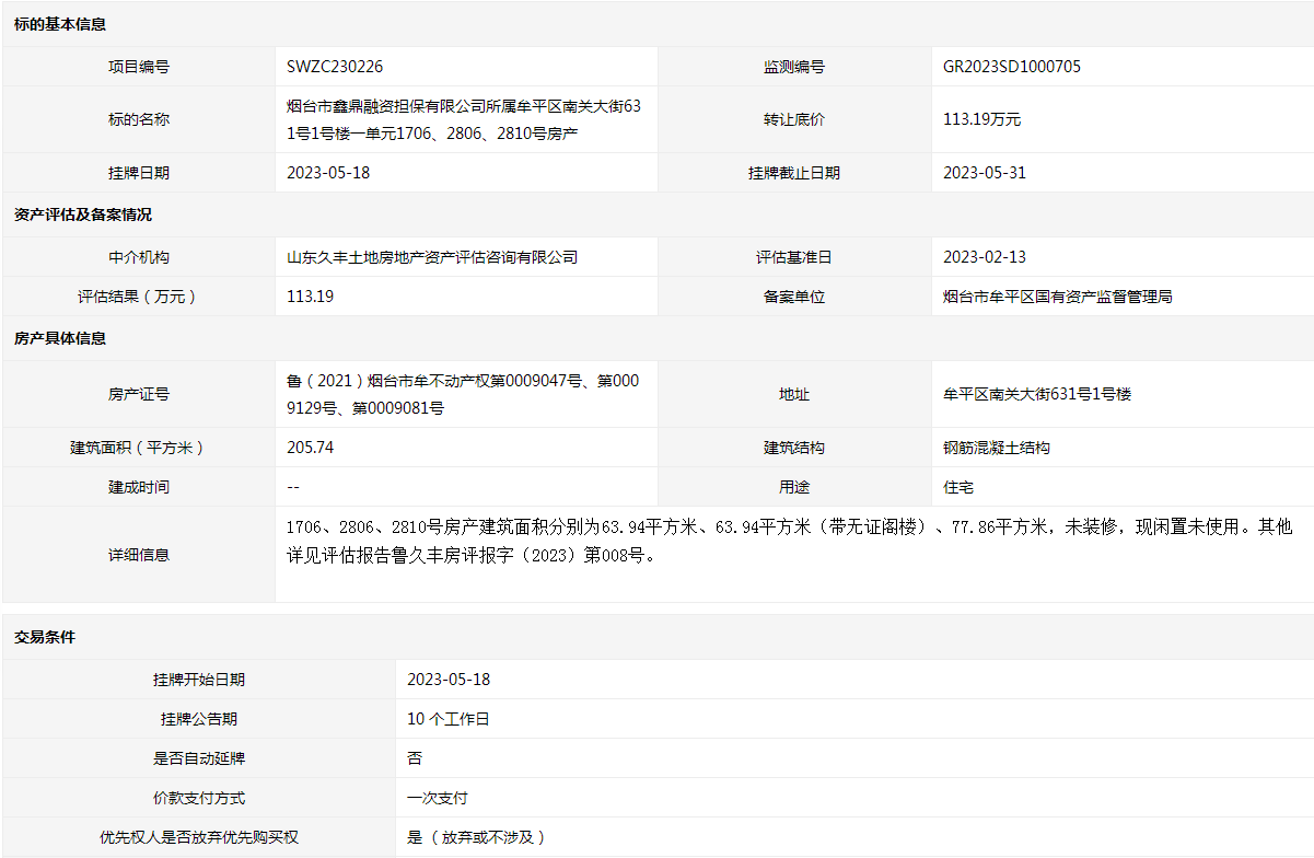 煙臺(tái)市鑫鼎融資擔(dān)保有限公司所屬牟平區(qū)南關(guān)大街631號(hào)1號(hào)樓一單元1706、2806、2810號(hào)房產(chǎn)