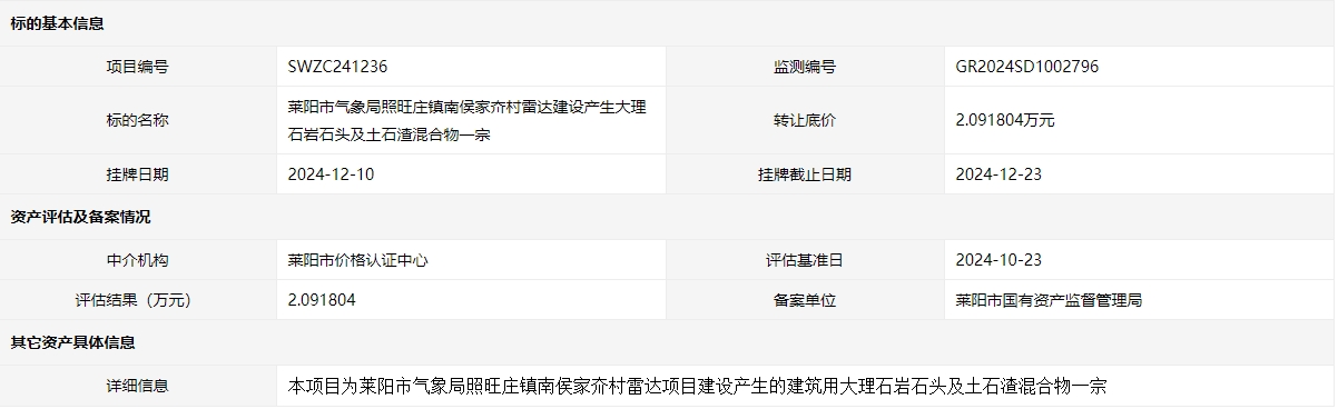 萊陽市氣象局照旺莊鎮(zhèn)南侯家夼村雷達建設產(chǎn)生大理石巖石頭及土石渣混合物一宗