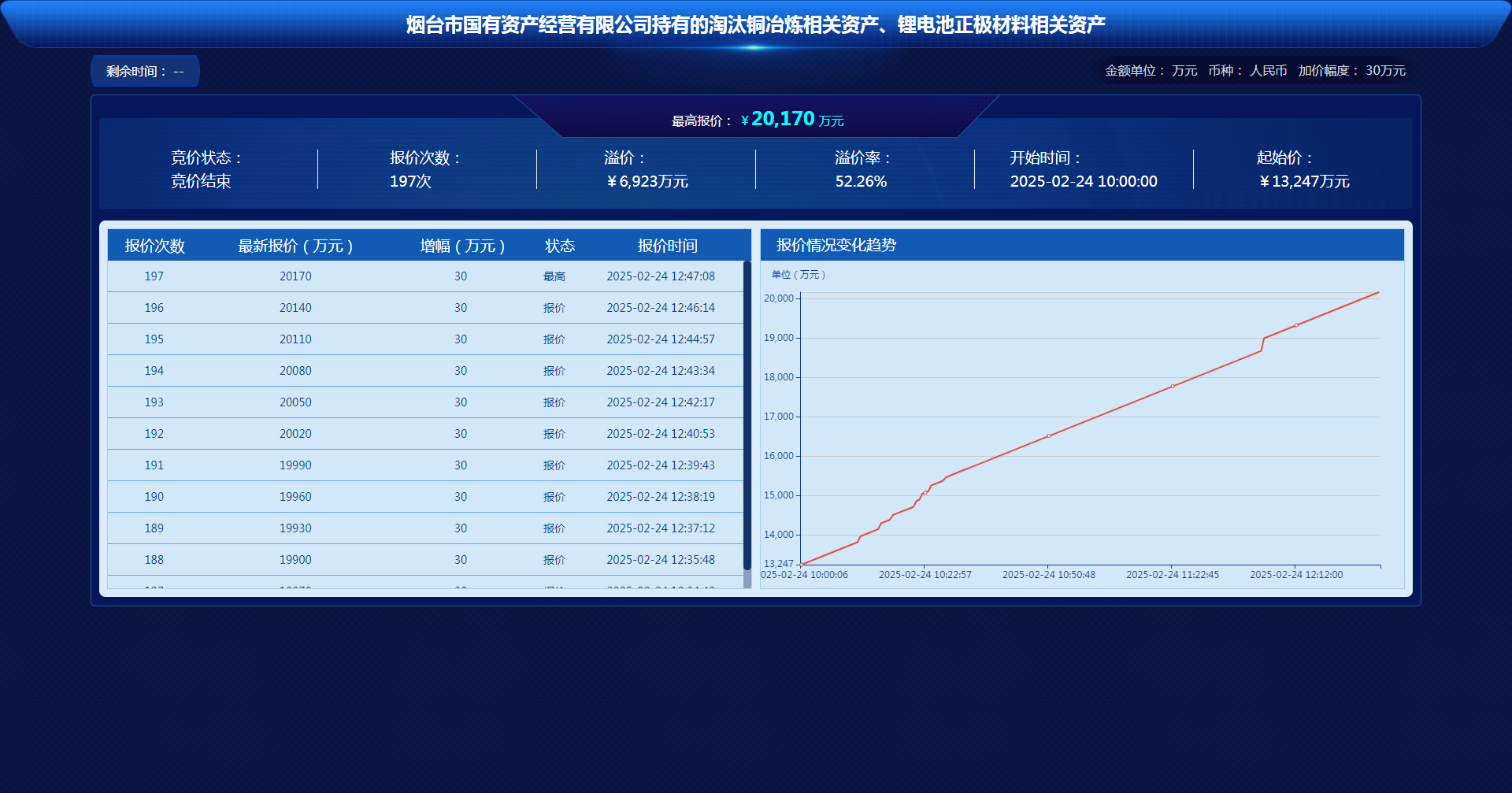 2月24日,“煙臺市國有資產(chǎn)經(jīng)營有限公司持有的淘汰銅冶煉相關(guān)資產(chǎn)、鋰電池正極材料相關(guān)資產(chǎn)項目”在山東產(chǎn)權(quán)交易中心以網(wǎng)絡(luò)競價方式成功出讓。此次交易歷經(jīng)197輪激烈競價,持續(xù)近3小時,最終成交金額定格在20170萬元,高于評估價8980萬元,較掛牌價溢價6923萬元,溢價率高達52.26%,成功創(chuàng)下煙臺聯(lián)合產(chǎn)權(quán)2025年首季資產(chǎn)盤活的“開門紅”。